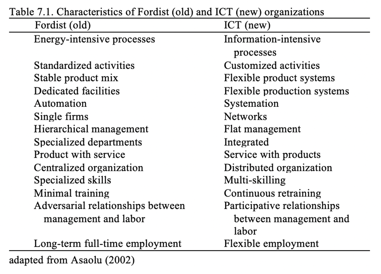I first encountered the terms “Fordist (old)” and “ICT (new)” in a 2006 article by Olumuyiwa Asaolu. Since then, I have seen the terms used in earlier works, and they are used to differentiate the nature of organizations and the work they do (and the workers and leaders they need). I summarized the differences in my 2015 book using this chart: