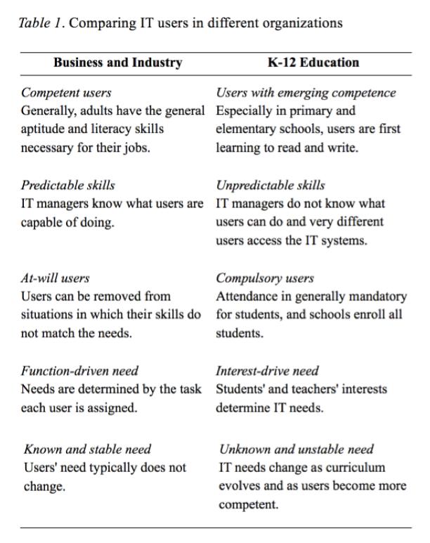 In my recently published Efficacious Technology Management: A Guide for School Leaders (which is available under a Creative Commons license), I include this chart to summarize the differences between IT users in business and industry and IT users in schools: